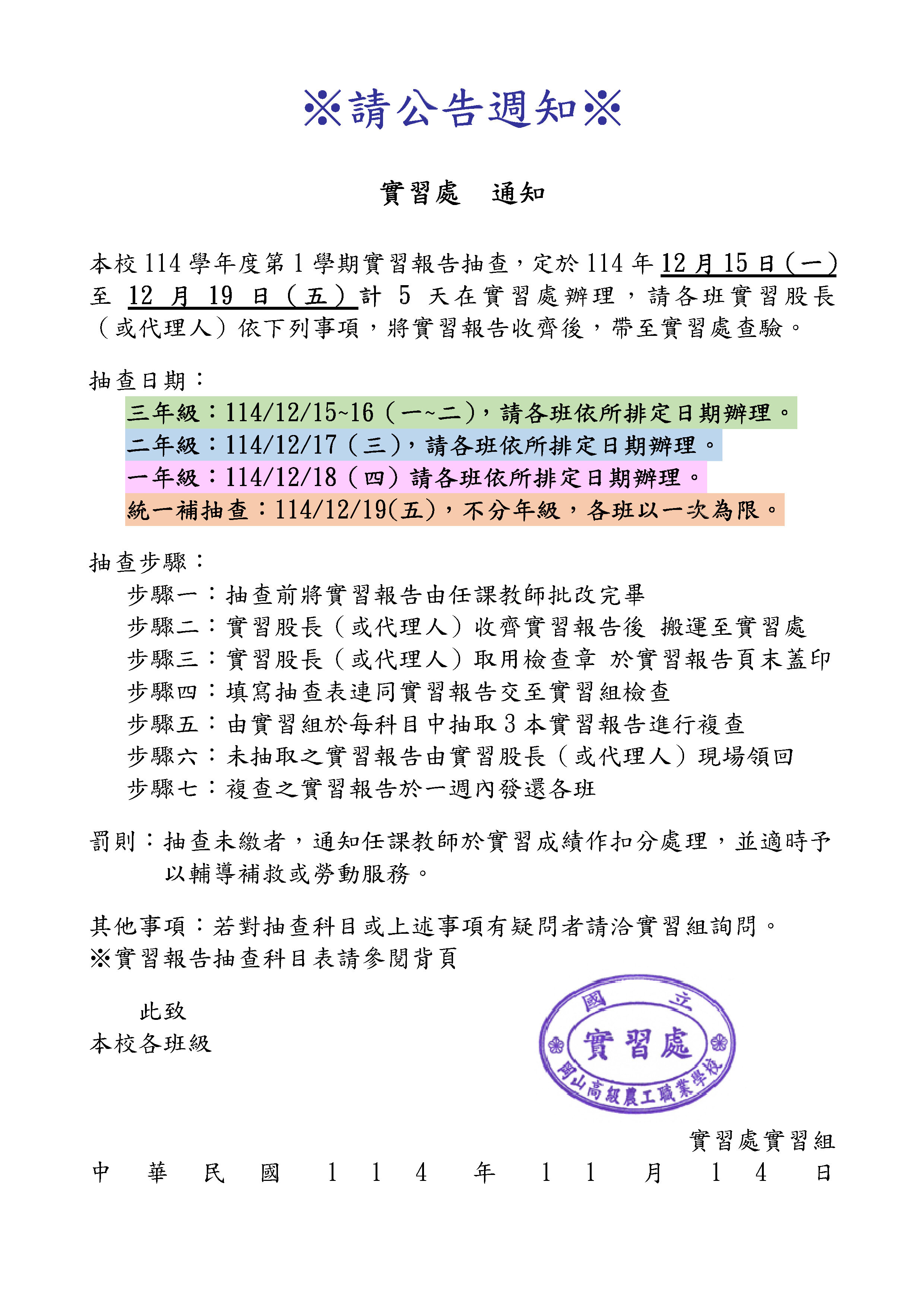 【實習報告抽查】114-1高一、二、三實習報告抽查