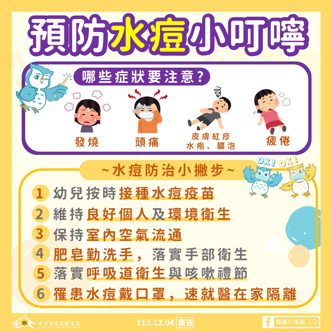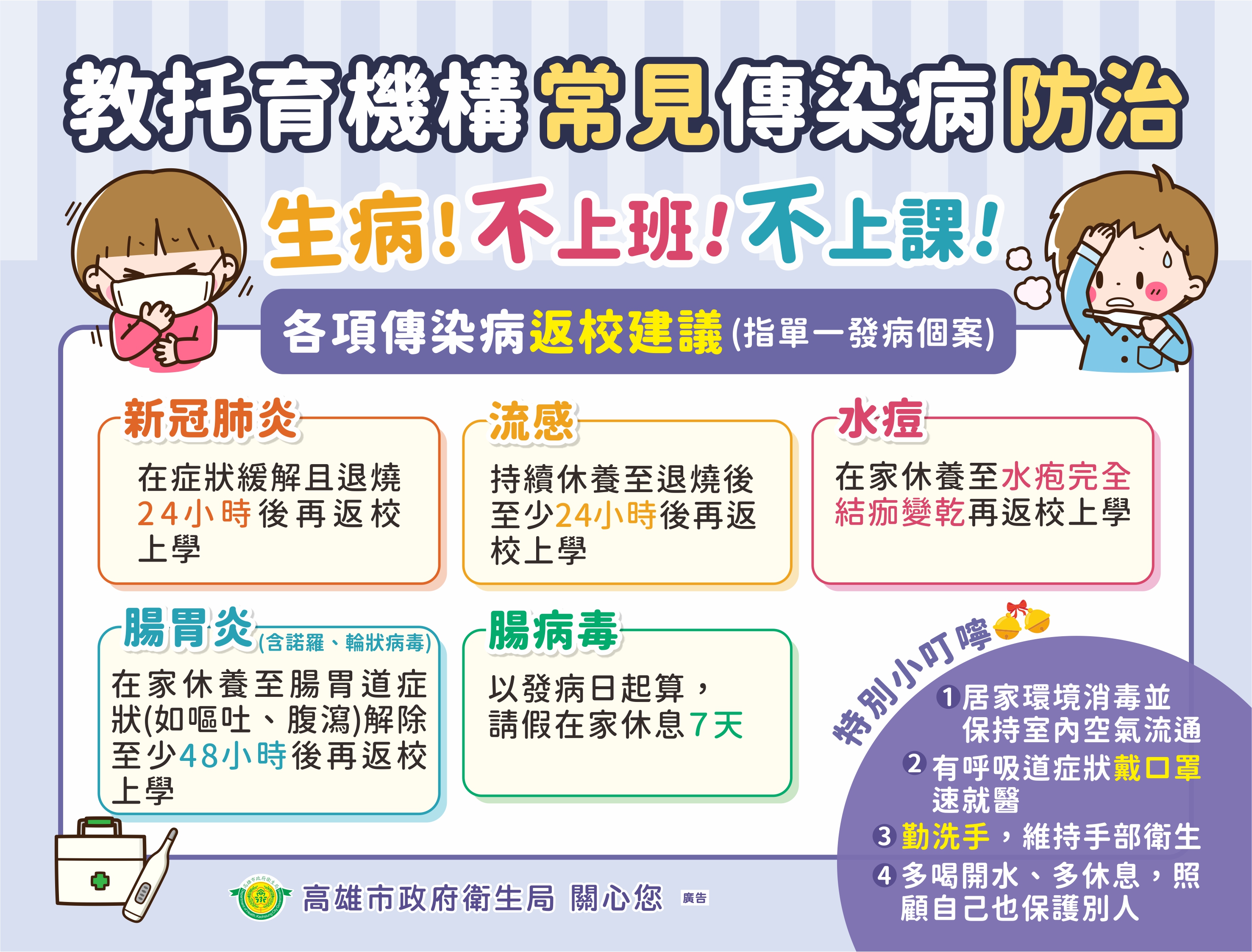 為防範新冠肺炎、流感、水痘、腸胃炎及腸病毒等傳染性疾病的流行,若有出現發燒或身體不適等症狀,請儘速佩戴口罩就醫治療,在症狀未緩解前請讓在家休養並做好自主管理(及個人衛生) ,以避免傳染給班上其他同學,家中若有其他手足,也請做好隔離照護,避免相互傳染。此外校方也會持續加強學(幼)生健康管理及校園清潔消毒工作,並落實正確洗手等衛教觀念。為共同維護校園環境健康。