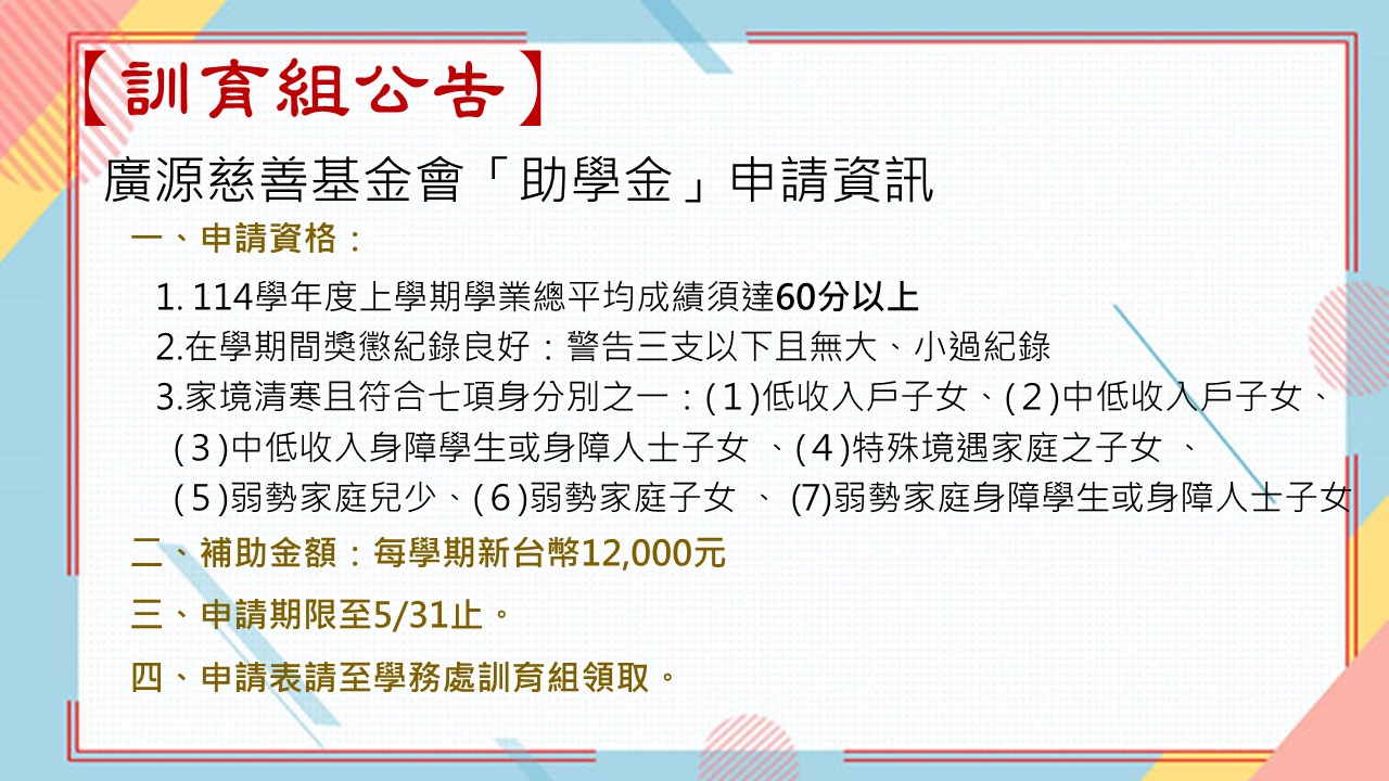 【訓育組】廣源慈善基金會「助學金」申請資訊